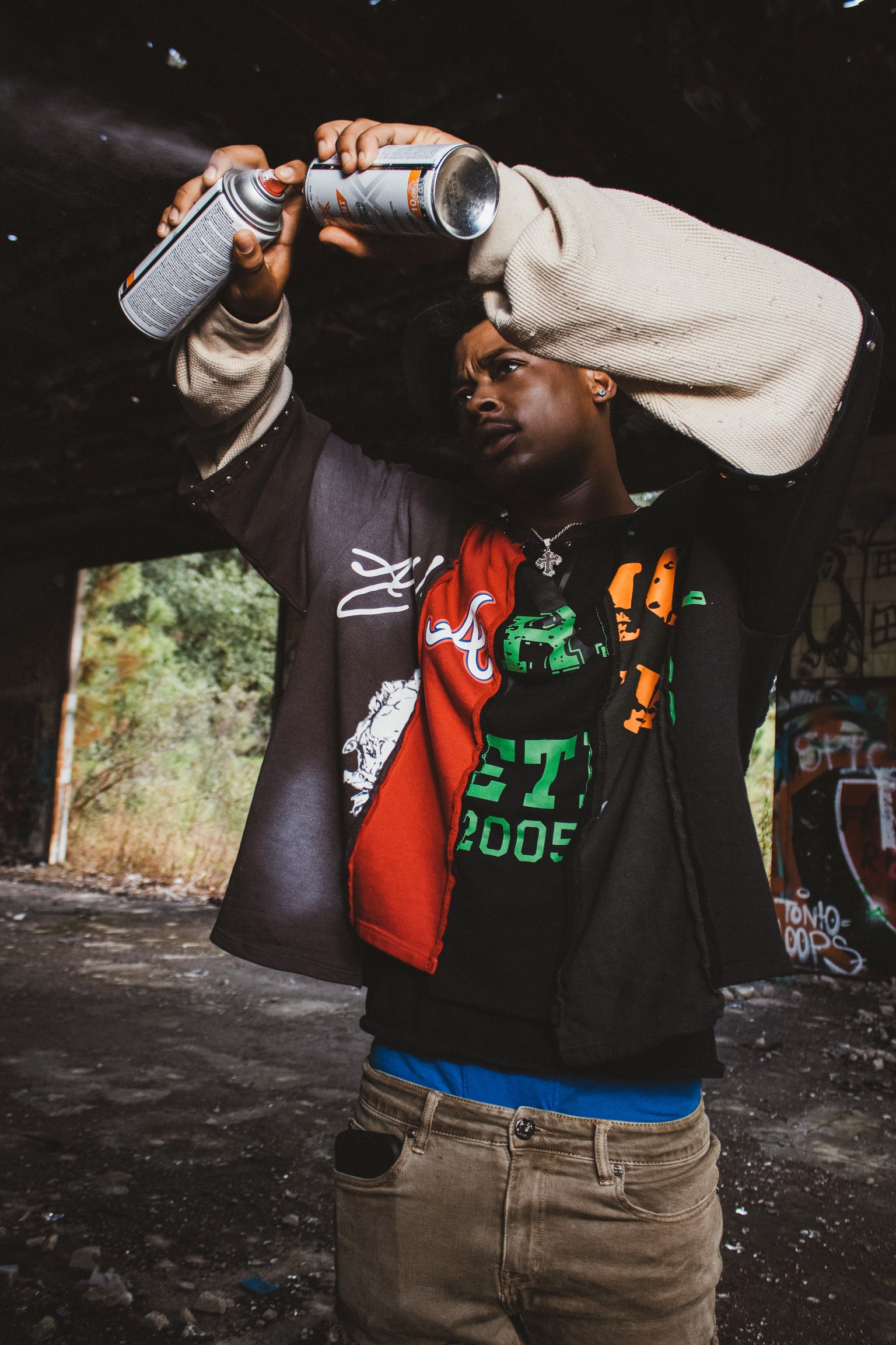 Our Fractured Double Sleeve tees consist of 5 different shirts stitched together.
